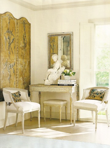Have I told you yet just how fabulous their home is? Filled to overflowing with painted Swedish and French antiques, it is a vision in soft, muted colors. Gustavian furniture is a close cousin to French furniture and they mix well together. Plain and checked linens cover the peeling painted wood frames of the chairs and sofas. Walls throughout are painted white and the wood floors are just as light. No fussy drapery here, instead wood shutters cover the windows. Sprinkled throughout the house are pieces from the Wisteria catalogue, but mostly the accessories are one-of-kind antiques, some of which will serve as inspirations to copy for the catalogue. Veranda magazine is based out of the deep south and thus, isn't available everywhere, so for those unable to buy it, here are a few highlights from the Newsom house: