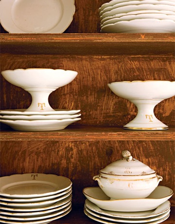 Set of white French dishes with owners' initial.