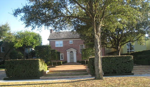 New facade: while windows are in the same place, they are new ones, new door color, ivy and shutters are long gone. The biggest difference is the landscaping. A landscape architect from England, brought to the project by Cargill, changed the center walkway. Now an alee of clipped, square shaped trees creates a path up the center of the lawn.
